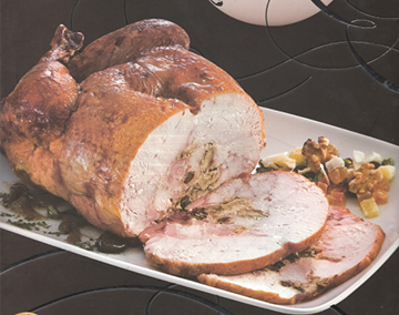 Muela una cebolla con ajo, mézclele las hierbas, las especias, con este adobo sobe el pavo por dentro y por fuera, así como con el zumo de limón.